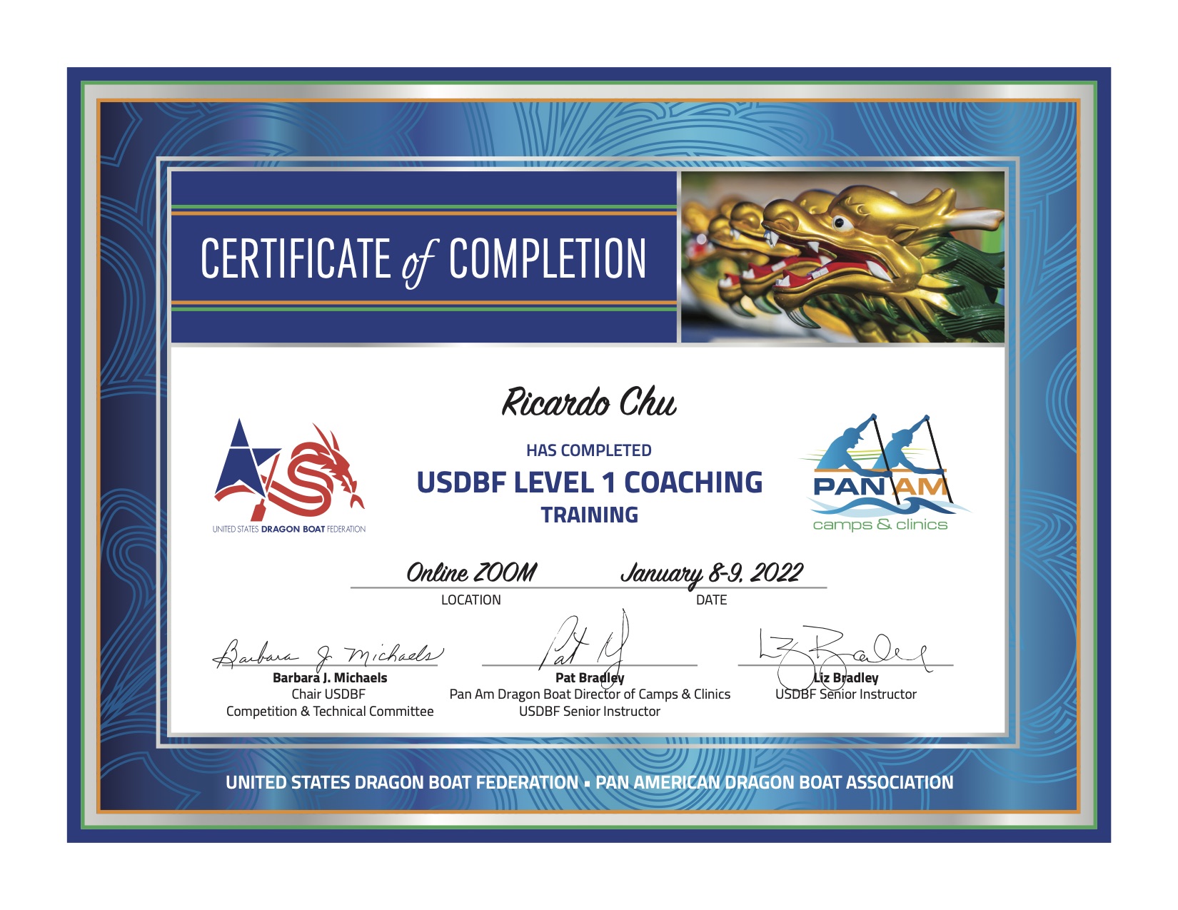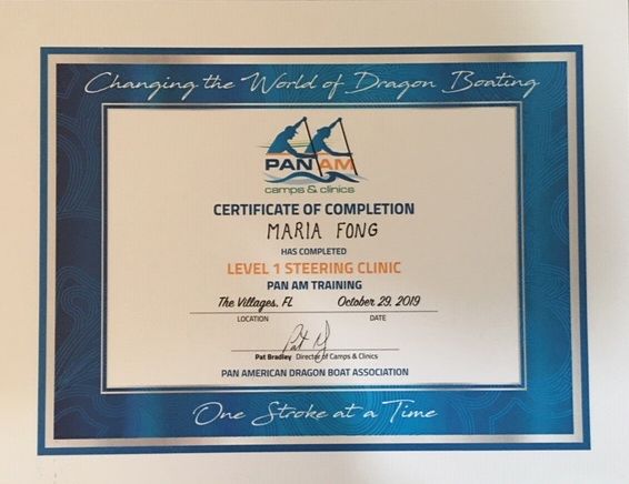 De igual manera, María Gabriela junto a Reynaldo Mejía, posición Engine, y al capitán Ricardo Chu han sido certificados como Coach Level 1 por el USDBF (Federación de Botes de Dragón de Estados Unidos).