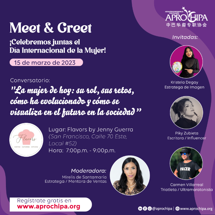 En honor a este día tan especial, a través del programa APROCHIPA MUJER, los invitamos a participar de este "Meet and Greet" modalidad conversatorio en donde compartiremos con mujeres extraordinarias y exitosas que nos hablarán de sus experiencias, retos e ideales. Ellas son: