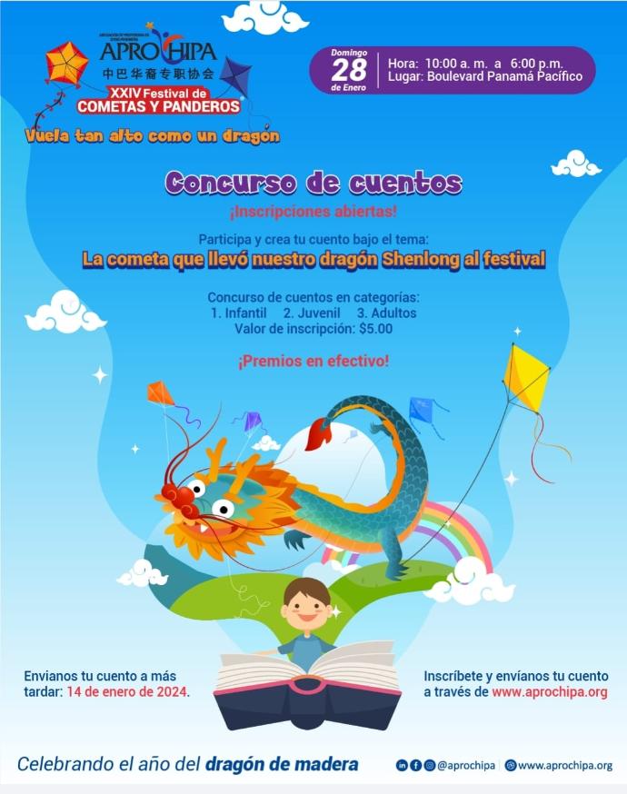 Regresamos con nuestro concurso de cuentos para contar la historia de Shenlong, nuestro adorado dragón de madera y mascota del XXIV Festival de Cometas y Panderos 2024.